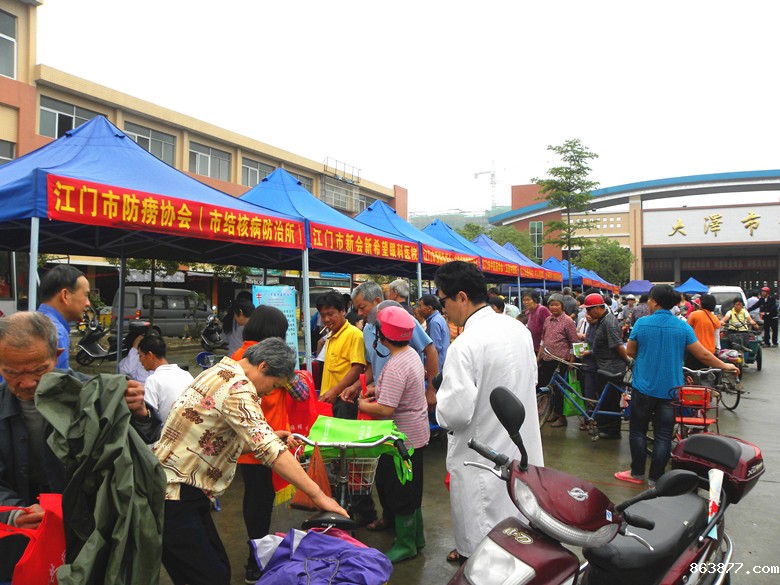 4月19日上午,江门市2013年科技文化卫生“三下乡”科普集市活动在新会区大泽镇文化广场举行。这是由江门市科协、市农业局联合新会区科协、区农业局和大泽镇政府共同举办的一场大型科普集市活动。活动围绕“节约能源资源、保护生态环境、保障安全健康、建设幸福侨乡”主题,为当地近3000名群众进行医疗卫生、农业技术、科普宣传等咨询服务。市医学会、市中医药学会、市预防医学会、市药学会、市防痨协会、市病媒生物防制协会、市农学会、市畜牧畜医学会、市气象学会等22个单位和部门共派出80多名科技专家和科普志愿者。江门市农业局、市科协和新会区有关部门的领导参加了活动。